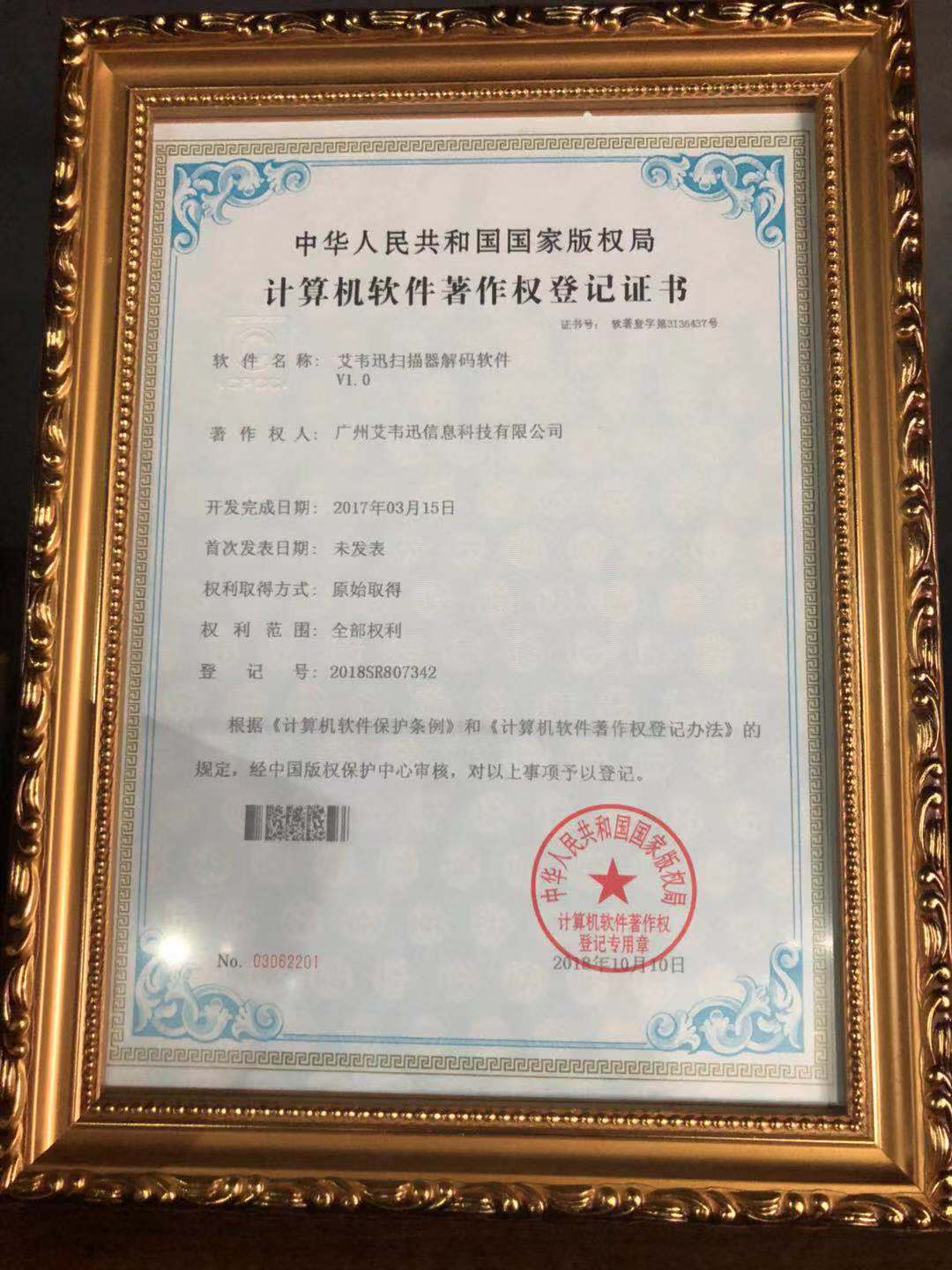熱烈祝賀艾韋迅科技獲得《艾韋迅掃描器解碼軟件V1.0》的軟件著作權證書。艾韋迅堅持自主創新研發,在條碼解碼領域堅持自己獨特的研發優勢。先后為客戶提供倉庫分揀掃碼、產線計件掃碼、質量追溯掃碼等創新技術服務。在長期技術研發和創新中,形成了擁有完全自主知識產權的新型條碼、二維碼解碼解決方案。《艾韋迅掃描器解碼軟件V1.0》軟件著作權證書的獲得,證明我們的在條碼物聯網應用領域的技術實力和研發精神。