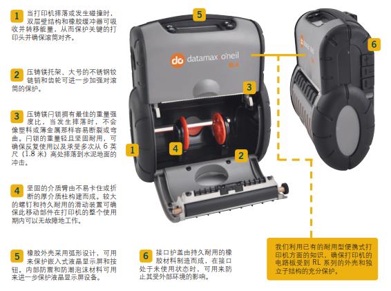 •  Datamax-O Neil?以生產堅固耐用、高度可靠的便攜式票據打印機而享有盛譽,現在它運用這一專長設計出了行業中最堅固耐用的便攜式標簽打印機。RL3(3?英寸/76?毫米)和?RL4(4?英寸/102?毫米)是持久耐用的熱敏式打印機,設計堅固,性能可靠,在其他打印機報廢后仍能繼續長期運行。事實上,我們對它們的質量和長期的可靠性非常有信心,為此我們為客戶提供?2?年的免費保修服務,比其他公司的保修期多出一倍。